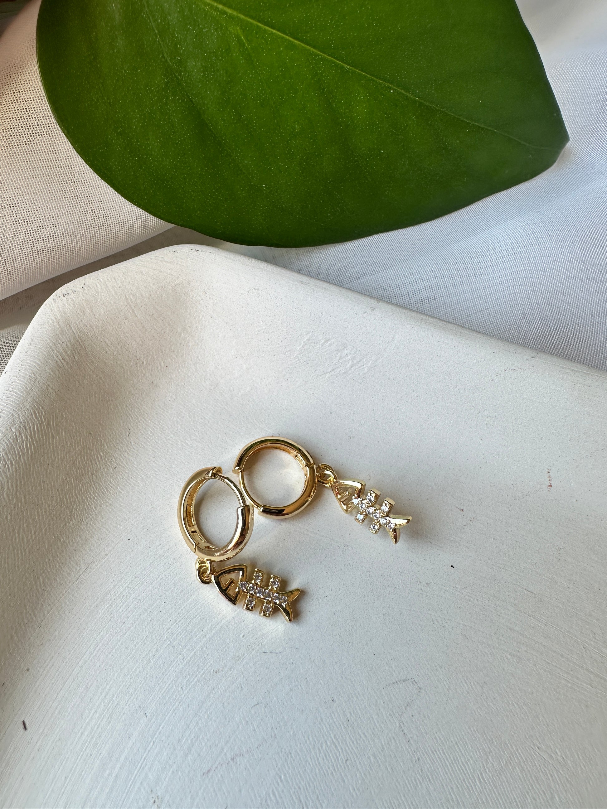24K Gold Filled Micro Pave Earrings Cubic Zirconia Fish Bone Charm