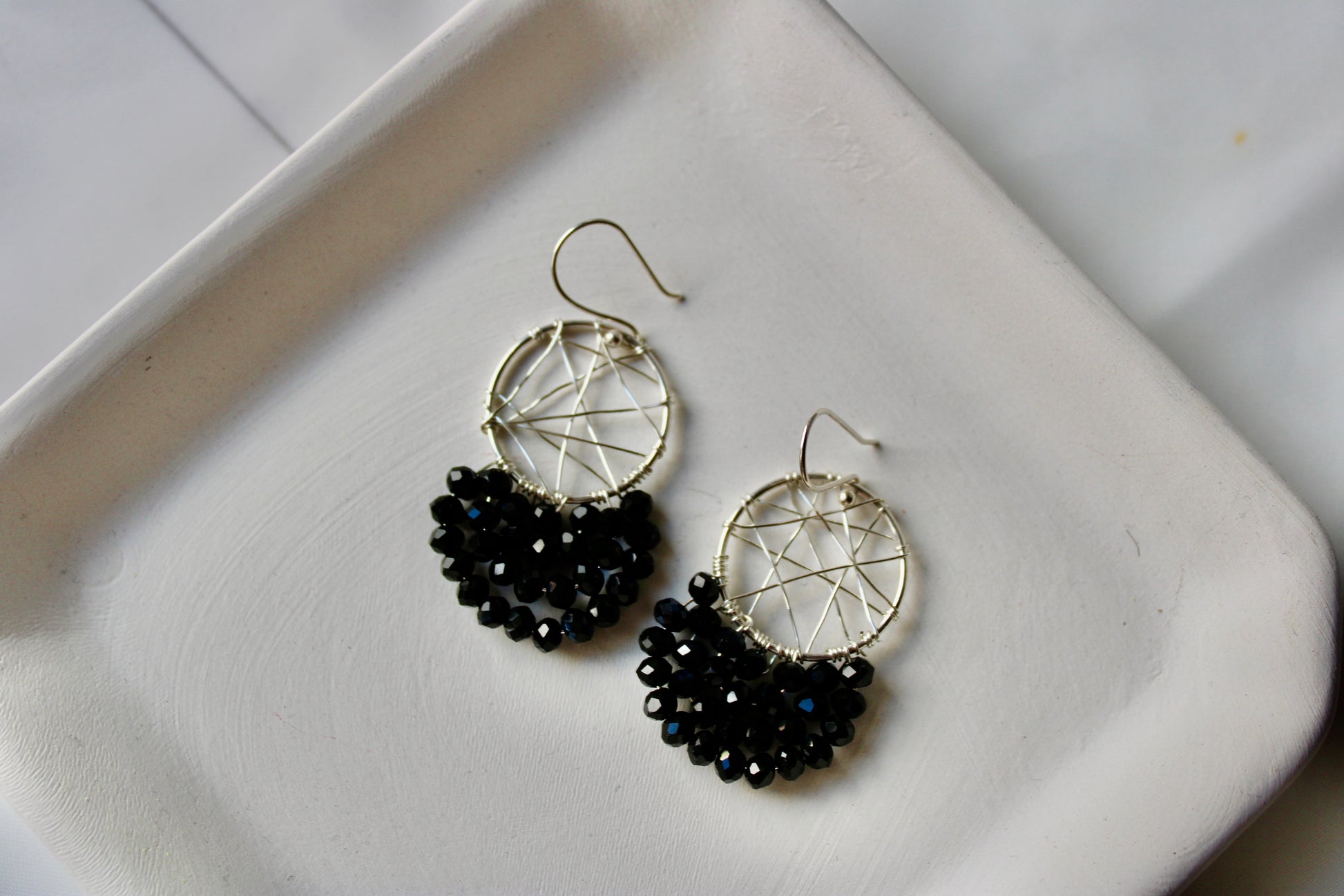 Sterling Silver Wire Wrapped Hoops with Black crystals Murano